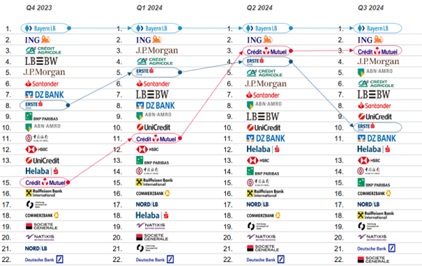 Das Q3 2024 Banken-Ranking wird erneut angeführt durch die Bayern LB (Score: 93,0), gefolgt von ING (Score: 90,5) und Crédit Mutuel (Score: 88,5). Letztere ist auch die größte Gewinnerin: Sie konnte sich um acht Plätze verbessern gegenüber Q1 2024.