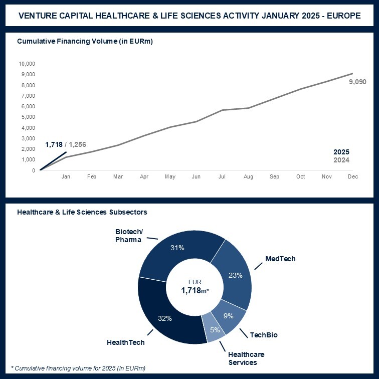 Im Januar sicherte sich Neko Health (Schweden) mit 251 Mio. EUR das höchste Transaktionsvolumen, gefolgt von Windward Bio (Schweiz) mit 192 Mio. EUR und Numab (Schweiz) mit 187 Mio. EUR