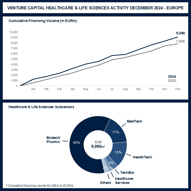 Im Gesamtjahr 2024 belief sich das VC-Investitionsvolumen für Healthcare & Life Sciences auf 9.090 Mio. EUR. Das entspricht einer Steigerung von 16,2% gegenüber dem Vorjahr (2023 mit 7.824 Mio. EUR).